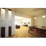 壁に向いていたI型キッチンは家族と対話しながら調理できる2.列型にし、和室は洋室に変更しました。4枚引戸で仕切って寝室として、あるいは開け放してリビングと一体化し、オーディースペースとしても使えるようにしています。北側の洋室や洗面室の間取りも改装し、廊下もLDKの一部に取り込んで無駄のない間取りになりました。 古紙を原料とした断熱材のセルロースファイバーを床や壁に施工し、内装は自然素材で仕上げています。