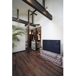 既存の洋室と廊下部分を取り込んで、約13.5帖のファミリーリビングが完成。内装はバリテイストに仕上げています。天井は勾配天井にし、構造梁を見せることに。最も高い部分は約4mの高さです。これにより縦の空間の広がりが生まれて床面積以上の広さが感じられます。抜けない通し柱と筋交いのあるコーナーにはバーシンクを設置してファミリーリビングとの緩やかなつながりを持たせています。