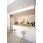 キッチンをオープンスタイルの対面型にし、屋根裏に上る階段を新たに設けるなどご夫妻の不満を解消するプランをご提案しました。そして内装はO様夫妻が希望するリゾートのイメージでまとめることに。ご夫妻がお持ちだった『グレートエスケープ』とタイトルのついたリゾートホテルのイメージ写真からプランづくりを始めました。住まい全体は白を基調にし、カフェのような対面型キッチンを造作。収納だった屋根裏はLDに向かって開放できるロフトに変え、開口部には障子をはめ込みました。O様こだわりのデザイナーズ家具もよく映える空間になりました。