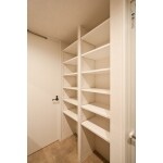 もともとのキッチンは独立型になっていましたが、思い切ってリビングダイニング空間と一体になった対面式のフルオープンタイプをプランニング致しました。吊戸棚も無くすっきりとしており、会話が弾み、とても明るいキッチンになっています。 面材は古木調のホワイトウッドで、室内全体の内装イメージと統一を図っています。 レンジフードは天井高の関係で、特注によるサイドフードを採用しています。 お皿や家電類はバックヤードのパントリーにレイアウトし、リビングからは直接見えないようになっています。 照明計画では、カウンターとシンクを照らすように集光タイプのダウンライトを取り付け、パントリーの照明は、人感センサー付ダウンライトにすることで利便性を高めています。