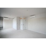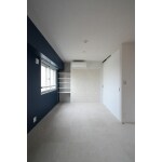洋室は将来、中央に壁を造作して仕切ることを想定し、開き扉を2セット取り付けています。開き扉の上部には明かり取りと通風のための滑り出し窓を取付け、レバーハンドルはリクシルオリジナルの商品からカワジュンの商品に付け替え、シンプルでありながらレトロなデザインに仕上げています。 床はふわふわとした触り心地が気持ちの良い、東リのタイルカーペットを採用しています。糊付けしていないので部分的に交換することができます。 窓側の壁面はご選定いただいたブルーの塗装で仕上げています。マットな質感がタイルカーペットの雰囲気とマッチし、落ち着いた印象になっています。 エアコンは先行配管で納め、壁面にはエコカラットを馬張りで部分張りしています。 巾木を取り付けていないため、室内がすっきりとした印象で仕上がっています。