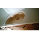 フルスライド収納、カウンターは人造大理石にしました。換気扇の納まりにはかなり苦労しましたが、工夫してシロッコタイプがすっきりおさまりました。既存(55cm)よりも奥行のある(65cm)キッチンでしたが、前面の壁を薄く作り直して、手前に出っ張らずに設置しました。