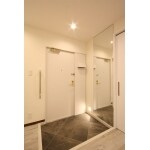 家の顔である玄関は、土間タイルをダイヤモンド貼りにしてアクセントを付けました。また天井まで続く大きな鏡を採用することにより、空間に広がりを持たせました。