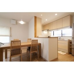 収納をカップボード等で充実しながら手元を腰壁兼用カウンター造作で隠したキッチン。かつ解放感は失わずにナチュラル系のフローリング、真っ白な壁紙で優しい雰囲気のリビングをご提案。