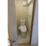 蜜結タイプの便器に交換、ウォシュレットを新しく取り付けました。ウォシュレット用にコンセントも 新設しました。 天井、壁はビニルクロス、床はクッションフロア仕上げです。 ドア位置は浴室側からキッチン側に移設しました。