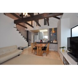北面玄関と水回りの間取りはとても暗くなりやすいため日中は2階の光が出来る限り1階まで到達できるように採光窓を多く配置しました。2世帯住宅のため2階の水回りの生活音が一階の漏れないように配管ルートも検討した。耐震工事においては壁量バランスを確保したうえで引き抜き力が多くなりすぎないように設計した。2階LDKと小屋裏収納への階段はデザイン性にこだわるとともに天井を最大限高く配置し断熱塗料を塗ることにより温熱環境にも配慮した。