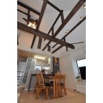 ダイニングの頭上には最大限に高くした天井と梁に塗装を施し照明を設置する事によりカフェを思わせる大空間に変身しました。