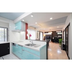スカイブルーのキッチンが爽やかな印象を与えさらに対面型キッチンによりで会話をしながら調理ができるようになりました。