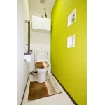 イエローグリーンのアクセントクロスを1面に貼りインパクトのあるトイレになりました。ニッチカウンター設けトイレ内のインテリアを楽しめます。