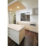 独立型のキッチンを前に出し、対面カウンターを設けて2.型のオープンキッチンにしました。キッチンだった場所は家事室として収納や洗濯機を置いています。キッチン周りも含め収納がたっぷり取れ、また、動線が短くて済み、効率良く作業していただけます。