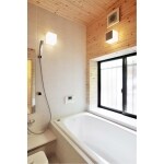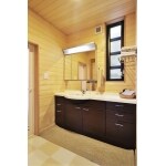家事室ができたので洗濯機をそちらに移し、洗面台を幅165cmの広いタイプへ変えました。ちょっとした作業も、二人同時に使うことにも対応できます。洗面室の内装には土台に使われる事の多いヒバ材をお勧めしました。ヒバは湿気に強く朽ちにくい材料でヒノキ科の持つ香りの強さも特徴です。森林浴のような香りの中、朝晩の時間は気持ちの切り替えに最適。壁、天井に無塗装で施工しましたので経年による色合いの変化も楽しみとのことです。