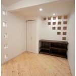 築50年以上の住まいは設備、内・外装ともに傷みが激しく全面的に手を入れることになりました。今までリビング、ダイニングに背を向けていたキッチンを玄関に近い方に移して対面式に。小さなお子様が遊んでいても目が配れるような位置にしています。キッチンにはカウンター収納を長く取り、リビングにはたっぷり一間の扉付きの収納を設け、物が散らからないよう工夫。お子様がいたずらして怪我をしないよう扉配慮しました。サッシはペアガラスに交換し隙間風を解消し、さらに断熱性を向上しています。柱を抜かずに明かりを取るためにスリットタイプの窓を要所に配し、暗かったLDKはグッと明るくなりました。階段との境の壁には明かり取りも兼ねて正方形の開口を作り、お爺様が作られたガラスの作品をはめ込みました。リビングには無垢材を斜めに敷き、横への広がりを演出。パイン材のフロアはお子様が走り回っても気持ち良く、キッチンにたつ奥様の冷えも随分楽になられたとお喜びいただけました。