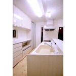 家族が見渡せるよう対面式に変えたキッチンはシンク上の吊戸を無くし開放的にする一方で、背面にはキッチンと同じ高さの長いカウンターと、吊戸を設け、収納量をたっぷり確保しました。2列型のキッチンは色々な作業を一度にやる時ができ、手の届きやすいところにある収納は出し入れも楽で効率の良い調理ができるようにしています。