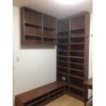 さまざまなサイズの本をお持ちでしたので可動棚でご提案いたしました。 本棚のお色味を邪魔しないよう、すっきりとしたデザインの棚柱で仕上げました。 今後、移動の可能性を視野に入れられておりましたので、固定はせず、楔で棚を支えに。 色合いやサイズ感等、塗装サンプルでご確認頂きました。