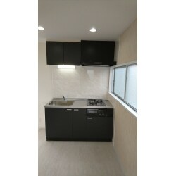 キッチンは黒い扉で汚れが目立ちにくく落ち着いた雰囲気に。壁にキッチンパネルを貼る事で、お手入れしやすく清潔感が保てるキッチンをご提案しています。