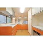 来客時に調理しながらも対応できる対面式のオープンキッチンになりました。さらにL型キッチンなので作業スペースひ広がりがあり大勢の来客にも対応できます。またリビングから見ると濃茶色のシックなイメージであり、内側からはオレンジ色のPOPなイメージの2面性を持った空間になりました。