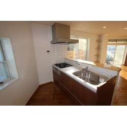 お料理しながらリビングにいる子供たちを見守れるようにと、対面キッチンをご希望の若いご夫婦。開放的なキッチンに仕上げました。