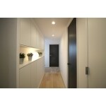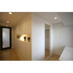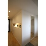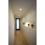 廊下向かって右手の洋室をウォークインクローゼットに変更する際、既存の廊下幅をゆとりのある広さに変更いたしました。 壁面収納にPanasonicキュビオスを採用し、大容量の収納を確保しつつスタイリッシュな印象に。