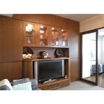 沢山の陶器をきれいに収納しつつ、同時にディスプレイとしての役割を持つ家具をご希望とのことでした。最初に提出させて頂いたプランは収納がメインのガラス扉を用いたプランでしたが、「もっとモダンなイメージで」ということで打合せを重ねたところ、このようなプランになりました。