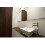 店舗全体の間取り変更に伴ってトイレ入口の位置が変更となったため、それに合わせて手洗い場を新設しました。不動産店舗ということで、多数のお客様のご来店が予想されますし、従業員の方の化粧室としてもご使用になられるということでしたので、カウンターを設置してゆったりとご使用いただけるデザインにリフォームしました。 鏡も横一面に貼付け、狭めの空間ながら少しでも広さを演出できるよう工夫しています。 内装は店舗・トイレに合わせた落ち着いたダークブラウンで統一しています。