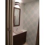 以前の空間は、ピンクの壁紙に白い手洗いカウンターが付いており、かわいらしい雰囲気の空間でした。しかし、今回はせっかくリフォームされるので、奥様の好きなテイストのエレガントさは残しつつ、きれいな水色の壁紙とその他の商品を木目のダークブラウンに統一したことで、甘くなりすぎず、大人らしい落ち着いたエレガント空間に仕上がりました。