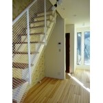 リビング内階段の為、階段での圧迫感をなくすように、横壁は格子状のものを使い、足元もオープンにして空間を隔てることのないように工夫しました。