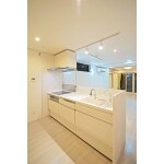 白を基調とした対面式のオープンキッチンです。リビングを見渡すことができ、家族との会話も弾みますね。ハイカウンター仕様のため、リビング側からは手元が見えないので、来客時にも目線が気になりません。
