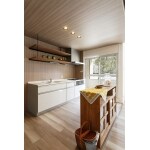 フローリングの板目に合わせて、アイカの木質パネルを天井にまで施工しました。インパクトのあるダイニングキッチンを演出。