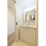 洗面台の位置を少し変えて、もともと洗面化粧台のあった場所には、洗濯機を置けるように洗濯パンが設置されています。