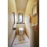 スッキリとした見た目で、空間を広く感じるタンクレストイレにリフォームしました。 今回施工したのは丸みを帯びた形状が可愛らしい、TOTO「ネオレストRHタイプ」です。 壁には、左官職人によって施された様な塗り壁調のクロス をご提案しました。独特の凹凸が美しい陰影を作り、上品さも醸し出されました。 汚れ防止の性能に加えて、強度もあるクロスなので、長く快適にお使いいただけます。 トイレの形状に合わせて、新調した手洗い器も丸型ボウルを選定されました。 上部には、トールペイントがご趣味の奥様が制作した鏡を設置しています。 優しげな雰囲気漂うレストルームにとてもマッチした、可愛い鏡です。