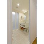 素焼きタイル風のお洒落なクッションフロアが印象的な洗面脱衣所