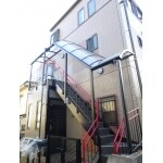 階段は鉄骨階段、長尺シートで仕上げました。 外壁も明るい色のタイルを提案しました。
