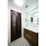 洗面台のキャビネットはクリナップ「S」を設置しました。 湿気や湿度に強いステンレスをキャビネット内部と引き出しの底板に採用しているため、カビやニオイが付きにくくお手入れがしやすくなりました。 全体的に生活感をなるべく出したくないとのご要望でしたので、洗濯機は折れ戸を設置し扉の中に隠しました。 洗濯機の上部には棚を取り付け、洗剤やストック品を収納していただけます。 扉のダークブラウンがアクセントになり、洗面空間が引き締まりました。 施主様がショールームに行き、気に入られたトーヨーキッチンスタイルのミラーとモザイクタイルを施工し、他にはないおしゃれなオリジナルの空間に仕上がりました。 さらに拡大鏡を設置しているので、例えばコンタクトレンズを装着する時やお化粧時など、鏡を近くで見たいときにとても便利です。 まるでホテルの洗面室のような、おしゃれな空間に仕上がりました。