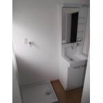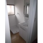 廊下部分を削り、洗面脱衣室を広げ、収納スペースが付いた洗面台を設置。 ドアから出入りの楽な引戸に変更。