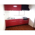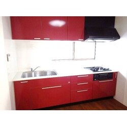 タカラの木製キッチン フェスカ。 とてもおしゃれな収納部は、木製とは思えないほど。ワインレッドのキッチンが室内を明るくしてくれます。 ワークトップは人工大理石なので、お掃除が簡単です。ステンレスのシンクもお手入れがしやすく、清潔感があります。 ホーローのキッチンと迷いましたが、価格面を考慮して木製タイプになりました。 また、既存の勝手口をふさぎ、その分キッチン部を広く取りました。既存のキッチンと比べると、雰囲気がかわりました。