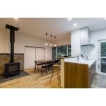 和室の続き間と2つの洋室を取り込み、思い切ってまとめることでゆとりと明るさをもたらし、動線の快適さと、床・壁・天井に自然素材を採用した、開放的なLDKの設計をし、ご提案しました。ご主人様は、自宅の裏山から切り出す木の活用方法に薪ストーブを設置されるのが当初からのご希望でございましたので、針葉樹燃焼が可能な日本製の「AGNI」をプランしました。