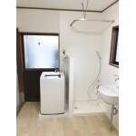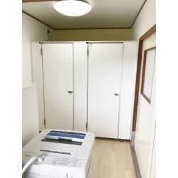 掃除流しがあった一角をシャワースペースとして、洗濯機との間に目隠し用の腰壁(高さ1.3m)を設置しました。 腰壁両面・壁面は不燃メラミン化粧板仕上として、水が飛んでも良いようにしました。