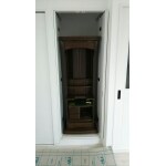 お仏壇は反対側の元押入れに移動し、『エコカラットを貼ったわんちゃんのトイレ』を組み込んだ造作キャビネットを設置しました。ニオイ、埃が入り込まないように2連の両開き扉を付けました。キャビネット内には可動棚を付けているので、わんちゃん関連グッズの他、様々なものを収納することが可能です。