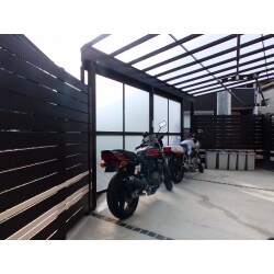 道路・隣地からの目隠しで樹脂フェンス・門扉を設置しました。3枚の白い板材がアクセントになっています。勝手口側にはバイク置き場、洗濯物干し、ゴミ置き場として使っていただけるテラス屋根を設置しました。