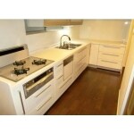 従来のキッチンは収納量が大変少なく困られていたので、I型キッチンからL型キッチンに変更、吊戸棚も取り付け位置に配慮。収納力UPとともに使い勝手もUPしました