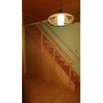 ホールの広さを利用して天井の加工と段板の枚数を増やし登り易い階段にしました。下の部分も収納物が隠れほこりが入らない収納スペースを確保しました。