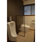床と壁がタイルなため、寒く暗かったトイレ。間仕切りを取り払い、一つの部屋とすることで開放的なトイレにしました。また、真壁を大壁にし、断熱材を入れ寒さ対策を行いました。内装材はトイレと小便器の壁にお手入れのし易いメラミン材を採用しました。トイレの入口扉には既存と色合いをあわせることで、廊下と違和感が無いようにしました。