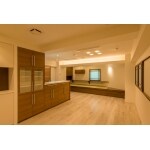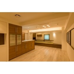 事務所として使われていた空間をリフォームしました。 オープンキッチンにしたことでリビング・ダイニングが開放的になり、全体が明るい空間となりました。 キッチンに立っていても家族の顔を見ることができ、家事をしながら家族とコミュニケーションをとることができます。 リビングのダウンライトは調光付きとし、シーンに合わせて効果を楽しむことができるようにしました。 畳のある小上がりの空間は、床下をキャスター収納とし収納をたっぷり確保しました。 また、ドア・窓は同じデザインで統一し、一体感を出しています。廊下の天井にも、アクセントに化粧付け梁を使いました。