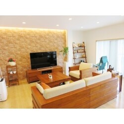 照明はダウンライトと温かい印象を感じる間接照明を ご提案しました。 内装は素朴な木目カラーや色を基調にナチュラルテイストのインテリアでシンプルかつ落ち着いた感じに、 ワンポイントとしてリビングにレンガ調のクロスをご提案しました。