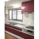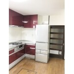 こちらも吊戸棚の高さも揃えて大きくし、収納力を上げつつスッキリするようになりました。 壁・天井のクロスも貼替した事により、かなり明るくなってシステムキッチンのバーガンティー色が映えるキッチンになりました。
