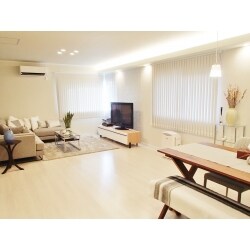 和室とリビングを一つの大空間に。さらに空間に広がりを感じるように窓際には縦型のラインドレープと壁一面の間接照明をご提案しました。