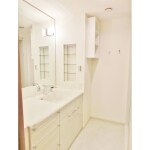 ゆったりひろびろ設計の洗面ボウルの横に壁面収納を配置し、高い清掃性と収納力を合わせ持った洗面化粧台をご提案しました。