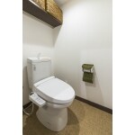 トイレも床だけ貼替えてアジアンテイストに。リビングのカウンターとお揃いの収納棚も取り付けました。