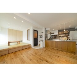 ・小上がりの和室がほしい。下に収納をつくる。 ・家族みんなが集まるキッチンやリビングにこだわりたい。 ・コストは抑えて個性的な空間にしたい。 ・無垢のドアや床材を使用したい。