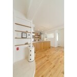 床にはナガイのユーロアンティーク、建具もナガイの無垢ドアを選ばれ塗装仕上げに…無垢材をたっぷり使用したナチュラルな空間に変わり、廊下とLDKを間仕切る濃紺の扉は空間のアクセントにもなりました。 リビングドアを開けるともうひとつの玄関が。 白い曲線のステージは配管の関係上どうしても残ってしまう段差を隠すためのプランでした。 のちに段差なしでも大丈夫と判明。でもこのプランが気に入ったNさんはあえて段差を残すことを選択されました。 リノベーションの中でどうしても譲れないと仰ったリビングの和室コーナーは今では家族が自然と集う場になっているそうです。